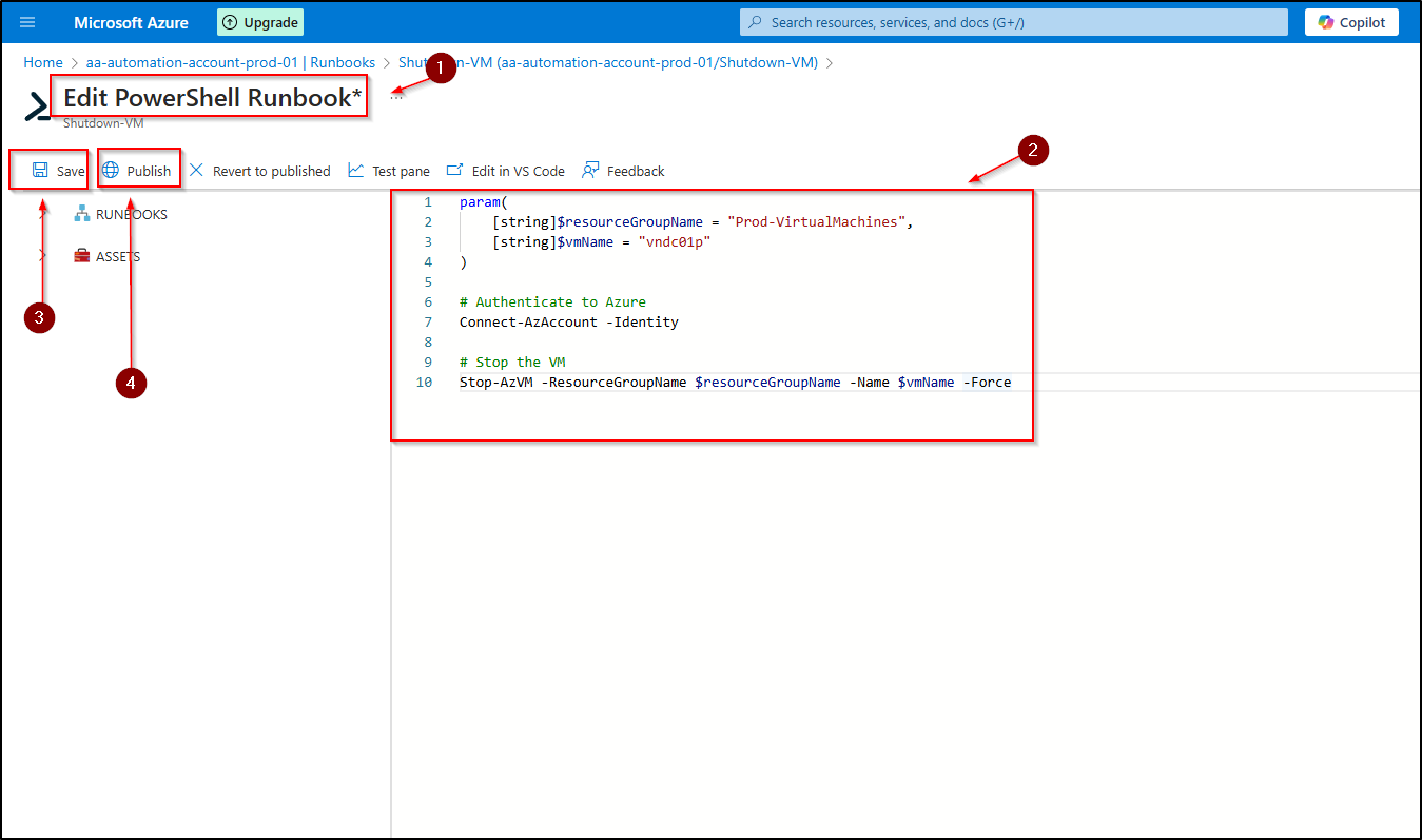 Stop-AzVM -ResourceGroupName $resourceGroupName -Name $vmName -ForceNote: Remember to replace placeholder values (like YourResourceGroupName and YourVirtualMachineName) with your actual Azure resource information before implementing the solution. 4. Click Save and then Publish the runbook