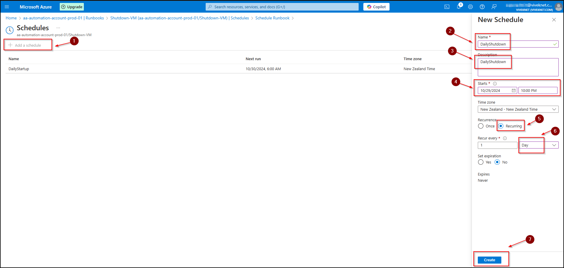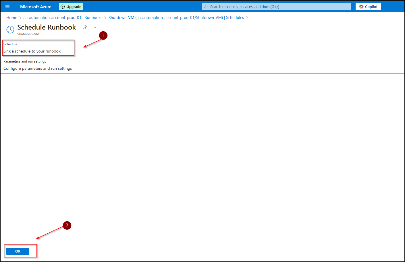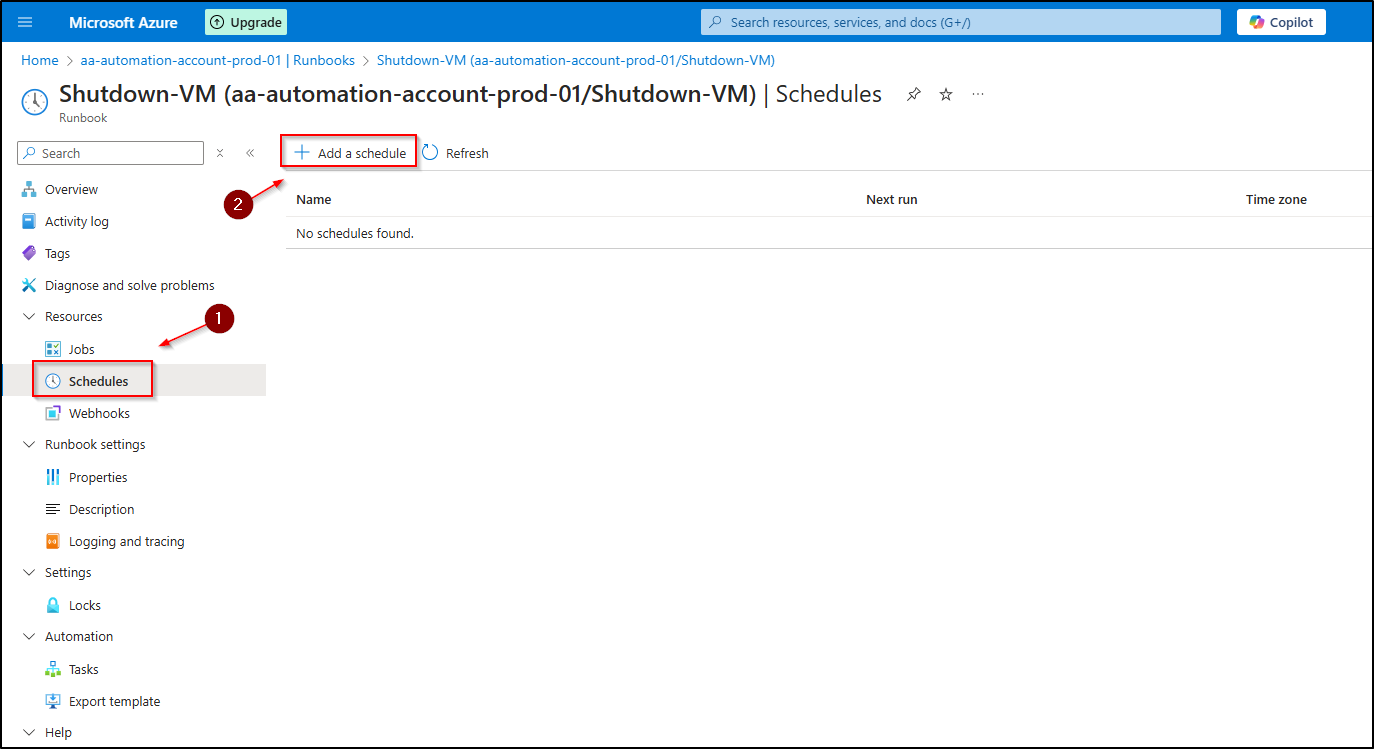 Shutdown-VMrunbook - Select "Schedules" and "Select Add a schedule"