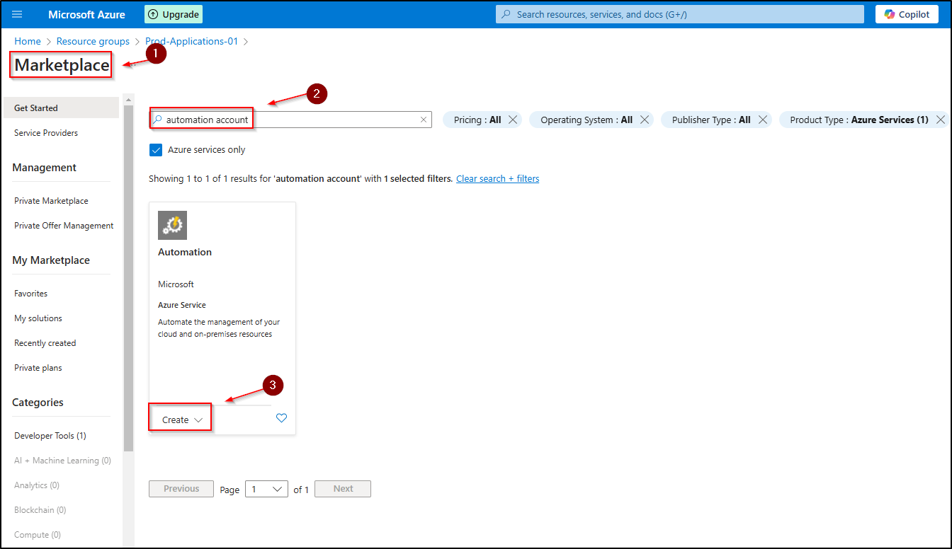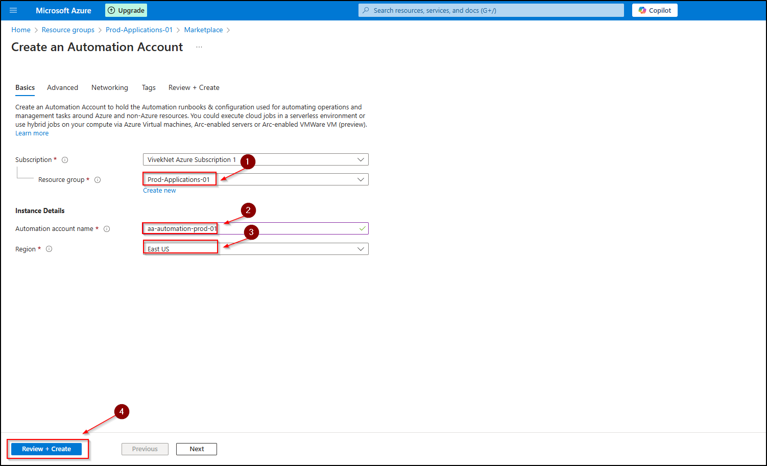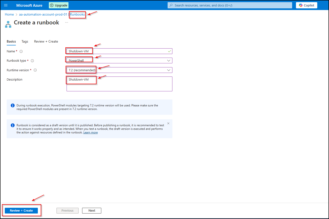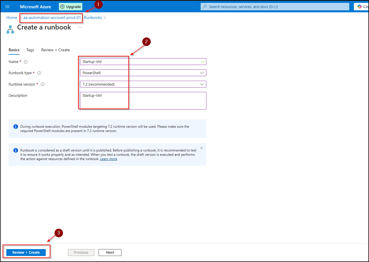 - Navigate to Process Automation → Runbooks → Create a runbook